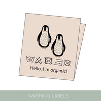 - Aufnäher mit verspieltem Motiv, Informationen zu Waschtipps und Zitaten auf der anderen Seite.